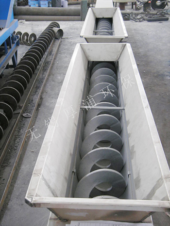 无轴螺旋输送机是用于传输工业生产过程中产生的各种废物及滤渣,结构形式为无轴螺旋,物料由进口输入,经螺旋输送至尾端排放,整个传输过程除进出口料斗外均在密闭槽体中进行。传动采用轴装式减速机,并在减速机端设置轴承及防尘油封。设备运行过程中没有高速运转部件,螺旋下衬耐磨尼龙,磨损低,维护量小。