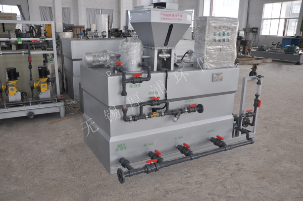 配制溶液从配制槽经熟化槽再进入储存槽,当储存槽液位处于高位时,配置过程自动停止,加药液过程继续,当溶液下降到中液位时,重新自动启动配料过程。配制槽和熟化槽均设置搅拌器,充分保证絮凝剂的稀释和熟化。另外,储存槽溶液不足时会触及下液位报警系统,所有系统均停止并报警。本装置是由具有自动化程度高、性能稳定、工作可靠、操作简单等特点。