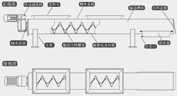 该压榨机输送压榨壳体采用U型槽式结构,上部封盖板,为增加出料高度,一般为平送出料。