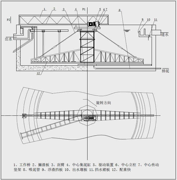 该设备采用中心传动、垂架式,污水进入周边配水槽内,经槽底配水孔均匀流入池内,并在周边挡水裙板的作用下,水流从池底流向中心,污泥依靠自重沉积于池底,从而形成泥水分离,驱动装置驱动中心竖架旋转,并带动刮臂及吸泥管旋转,在静水压力的作用下,污泥均匀地进入吸管上布置的吸口,然后通过中心排泥井的套筒阀排出池外。排泥量的大小可由套筒阀的升降度来控制,水面的浮渣通过撇清装置撇向池边,再由刮渣耙刮进排渣斗内排出池外。